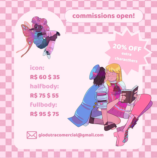 atualizações para aprovação em cada etapa até a finalização.Horário de atendimento: de segunda a sexta-feira, das 10h às 19h (horário de Brasília). Mensagens enviadas fora deste período serão respondidas no próximo horário útil.⭑ ComissãoPara iniciar o serviço, o cliente precisa enviar todos os detalhes do pedido (exemplo: quantos personagens, plano de fundo, paleta de cores, imagens de referência ou qualquer outra coisa disponível).O prazo de entrega será combinado dependendo da complexidade do serviço. Em caso de prorrogação, o cliente será informado com antecedência.A arte finalizada poderá ser publicada em minhas redes sociais, exceto quando o cliente,solicitar explicitamente que o pedido seja mantido privado.Após a aprovação do orçamento e detalhes, o trabalho será iniciado em até 5 dias úteis.Todas as artes incluem minha assinatura. Caso solicitado, ela poderá ser posicionada de forma discreta.⭑ Uso da ImagemO pagamento garante ao cliente apenas o uso pessoal da arte. Se publicada em redes sociais, é obrigatório me dar os créditos.É estritamente proibido utilizar a arte em geradores de imagens por inteligência artificial ou revendê-la sob qualquer forma.